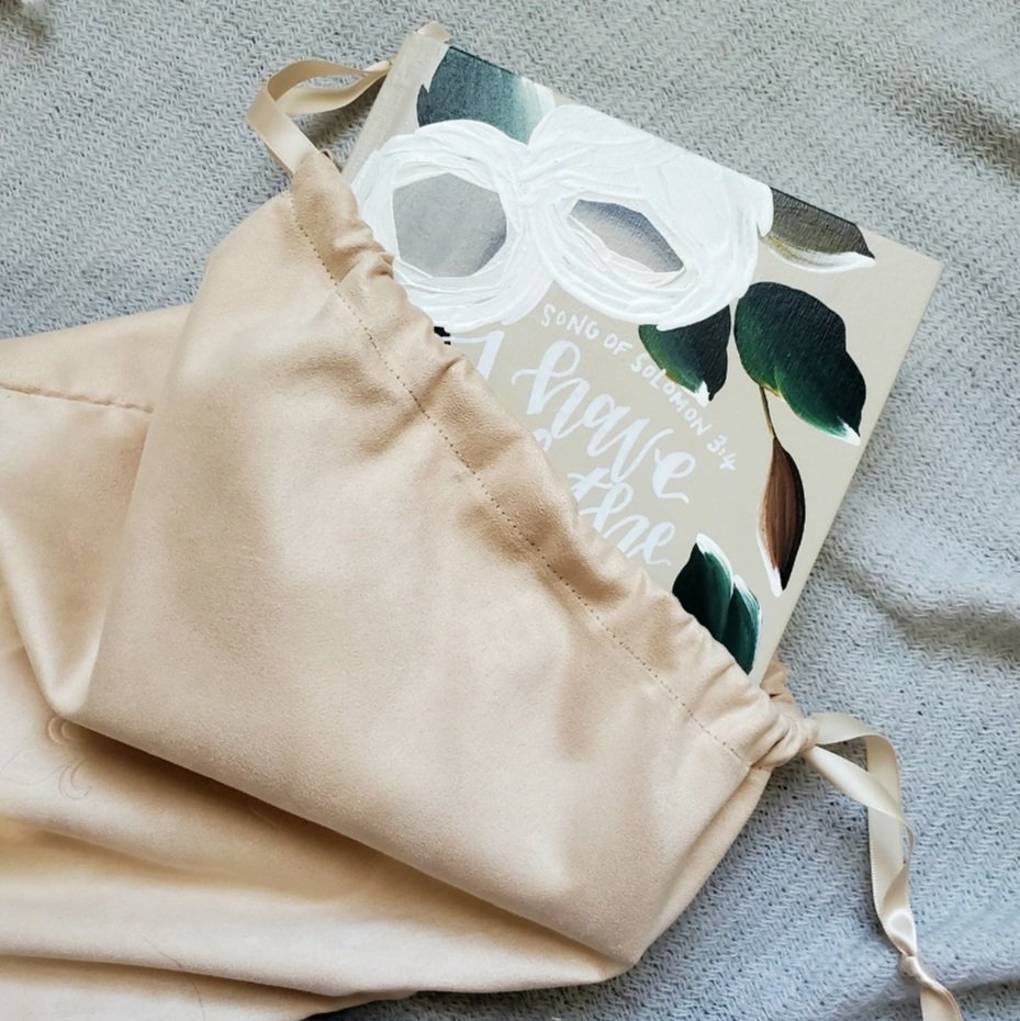 A soft, drawstring bag that provides light protection and is perfect for gifting a Bible to someone.